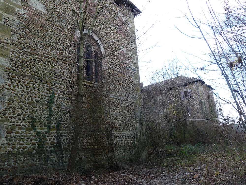 Nous regardons autour de nous et nous sommes dans ce que l’on peut considérer comme la chapelle, un endroit très décoré dans lequel on peut encore apprécier un magnifique vitrail quasiment intact. Chapelle ou du moins ce qu’il en reste, car ici plus d’autel, pas de croix ni de cierge, même le sol a disparu, ce qui permet d’ailleurs d’observer des fondations. Je me suis laissé aller à imaginer que peut-être ce sont les fondations d’un précédent bâtiment en pierre (différente du bâtiment actuel), peut-être un ancien lieu de culte sur lequel “l’actuelle chapelle” fut construite.